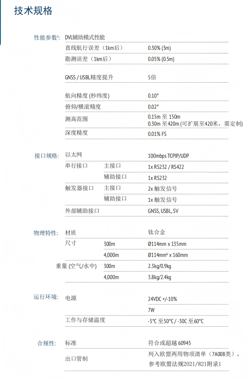 该导航系统配备双触发接口,可实现时间同步与多普勒测速 仪(DVL)触发功能,有效协调多部声学传感器工作,从而使 其成为真正意义上的专业级勘测解决方案。